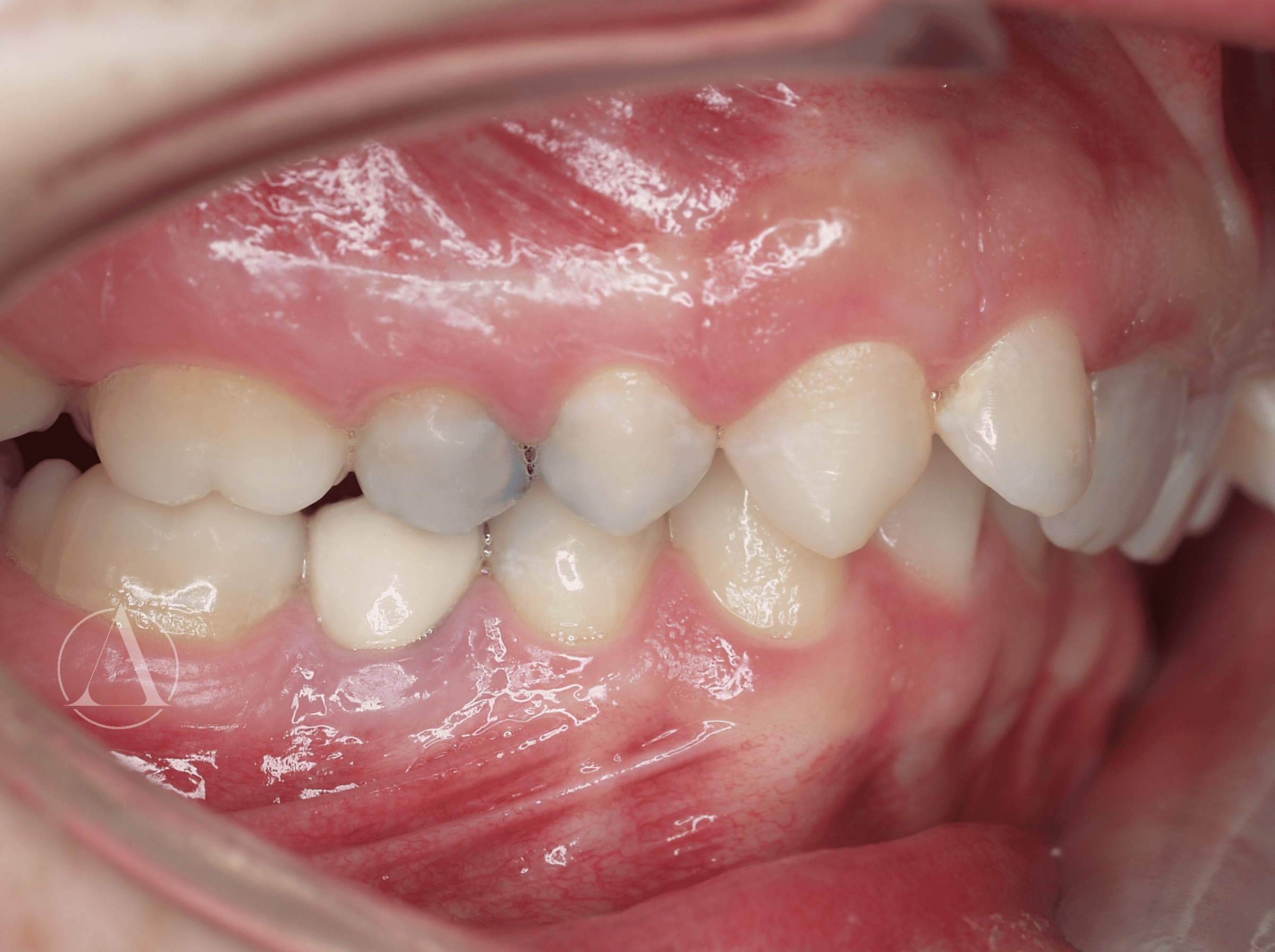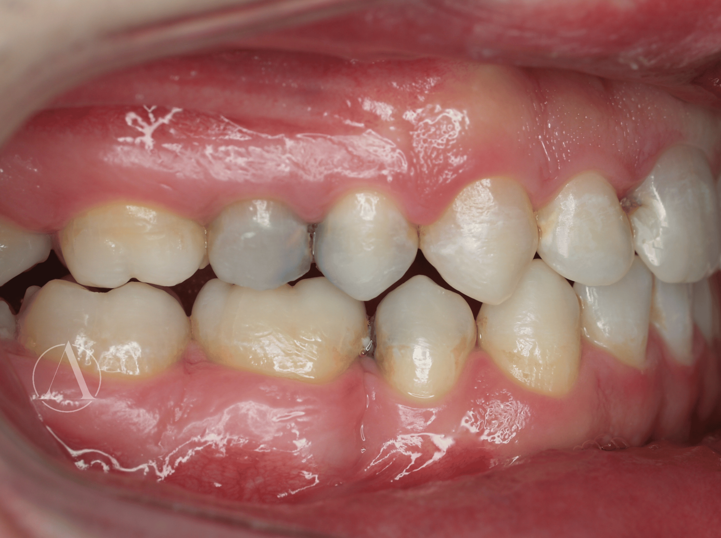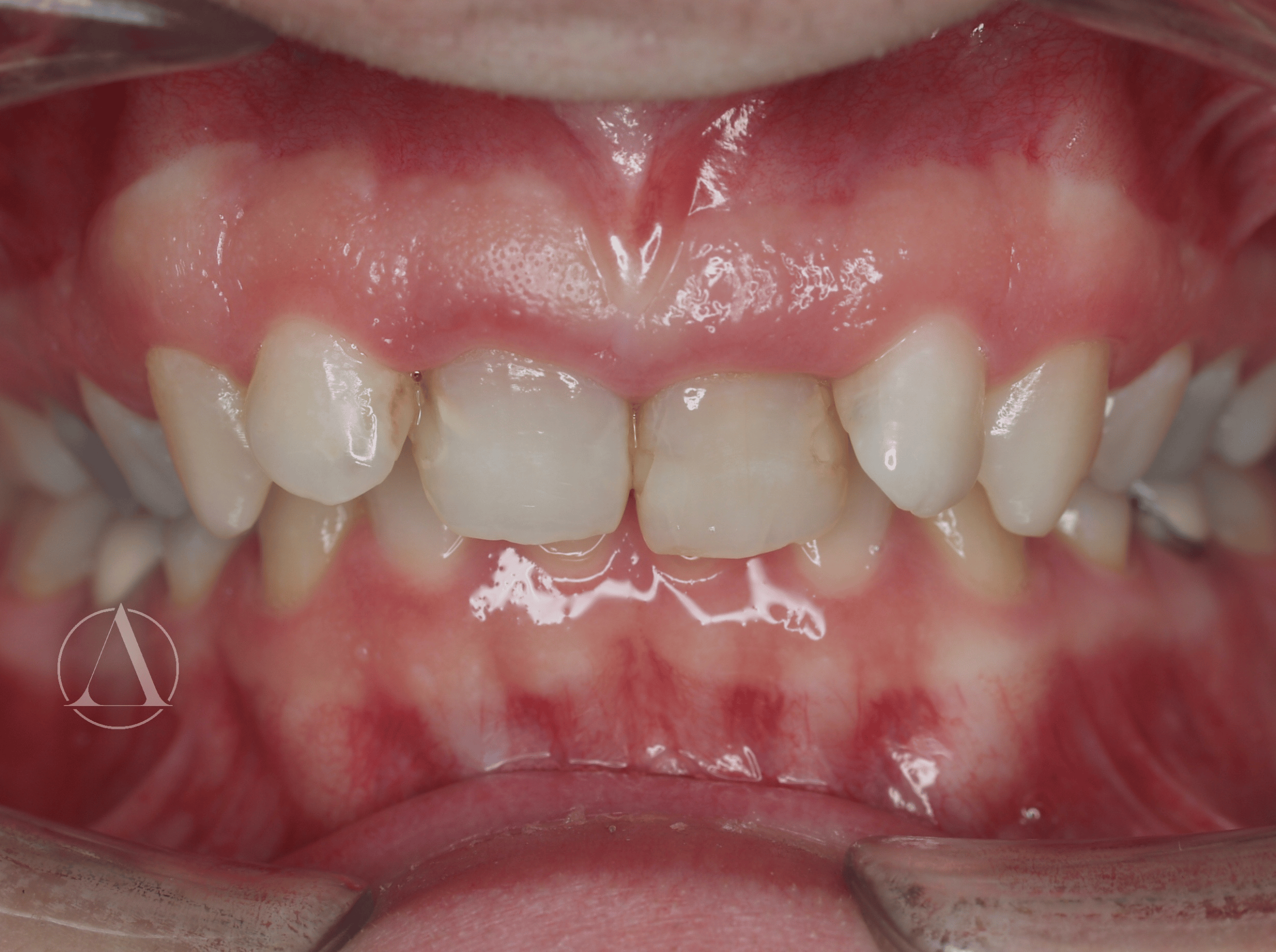 Upper teeth pushed back by lower lip to meet lower teeth (Retroclined).